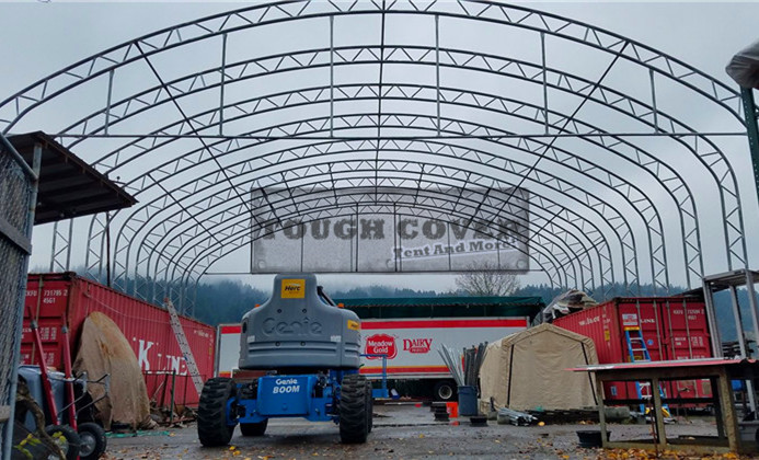 This photo from customer assembly located in United States. It's a 17m(56') wide container shelter that mounted on 53' long shipping containers. The sidewall is 2.5m(8.2') high, the peak high is 6.1m(20'), so after installed on containers, the total peak high will be 8.7m(28'5"). You could get a great space under lower budget with our container cover/shelter. The slanting crossing purlins could hold the structure as a whole. The double truss structure give enough ability for heavy snow and wind.