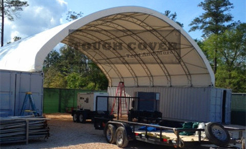 This photo was taken by our New USA customer. The model in this photo is our container cover, shelter tent TC4040C, size: W42 x L40 x H13 feet (W12.72 x L12.19 x H4.0 meters). It is designed for installing on standard shipping containers, or on the ground or walls. As you can see from the photo, it's double truss structure for strong wind/snow load, total 7 groups truss arches on 6.6ft(2.0m) spacing, with slanting support tubes at end spacings. As customer request, we could also make the end walls with door, or closed/blank.