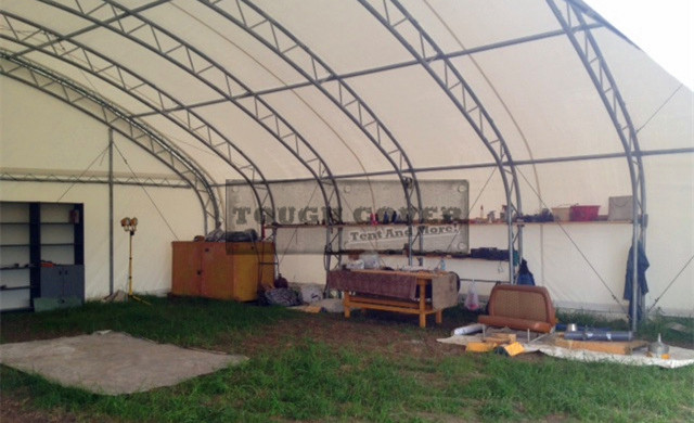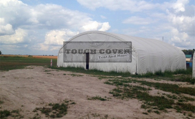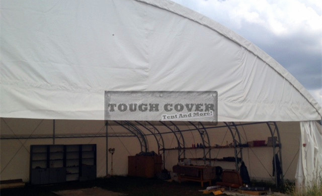 The hangar fabric building in photos is model TC4636, size: 14m wide, 11m long and 4.8m peak high (W46 x L36 x H16 feet). This clearspan structure do not have any interior columns that could offer the maximum useable space, you could get a great height and clearance for your cargos, equipments, vehicles, forklifts and so on. As show in photos, it's double tube truss structure, the truss arch spacing is only 1.8 meters (6 feet) for heavy load. With one sliding door at front end, opening size W11 x H2.3 meters(W36 x H7.5 feet). (For eve higher and larger door opening request, we could make zipper roll up door, the opening size could be 12.1m(40ft) wide, 2.3m(7.5ft) high at sides and 4.5m(15ft) peak high).