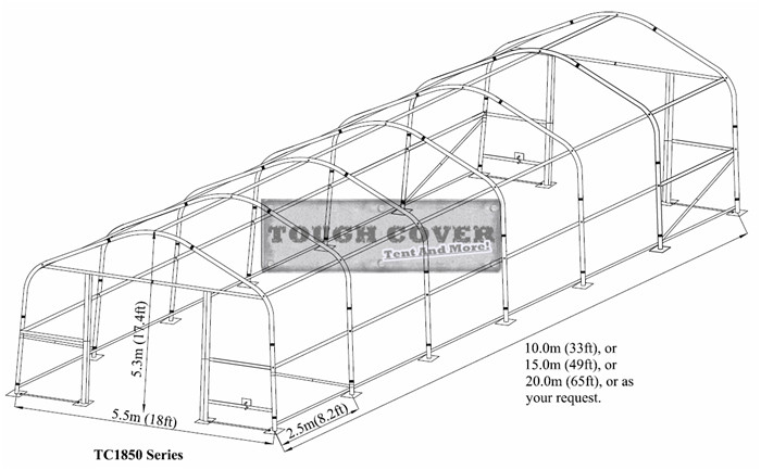 Why should you consider the TC1850 series storage tent? When it comes to finding a reliable and durable storage solution, the TC1850 series outdoor storage tent by ToughCover stands out. With a width of 5.5 meters (18ft) and a height of 5.3 meters (17ft), this versatile tent is perfect for various applications, including use as a carport. Its structure is crafted from 76x2.0mm galvanized steel pipes, ensuring a robust and long-lasting frame.
