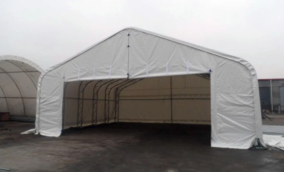 1. Strong Double Truss Style for heavy load. Hot galvanized steel structure for Antirust. 2. 9.7 meters (32 feet) width, by 9.15 meters (30 feet) length, by 4.7 meters (15.4 feet) height 3. 3-zippers roll up door. 4. Fabric: 300g/m2 PE or 610g/m2 PVC. 5. Prefabricated Fabric Storage Buildings, Steel Structure, RV Shelter